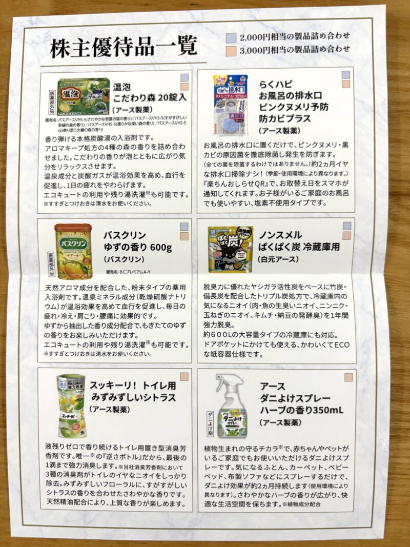 - 優待内容:自社製品詰め合わせ(虫ケア用品、入浴剤、オーラルケアなど)